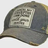 Vintage distressed trucker cap "cancel my subscription i'm done with your issues" Color: navy blue distressed Material: cotton/polyester blend, mesh back. Size: one size fits most, with an adjustable snap back strap. Unisex cap.