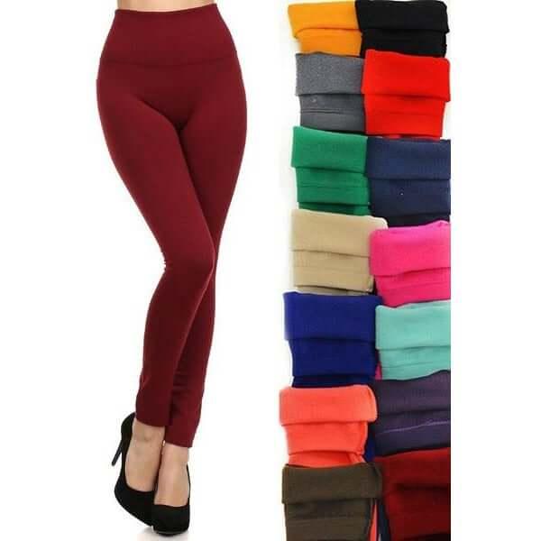 Super soft, High waist fleece leggings with thick wide band for tummy control. Long, skinny leg design Comfortable and easy pull-on style Solid color Very Stretchy 5 3/4" Waist Band, 36" Length One Size Fits Most Fits like a Glove