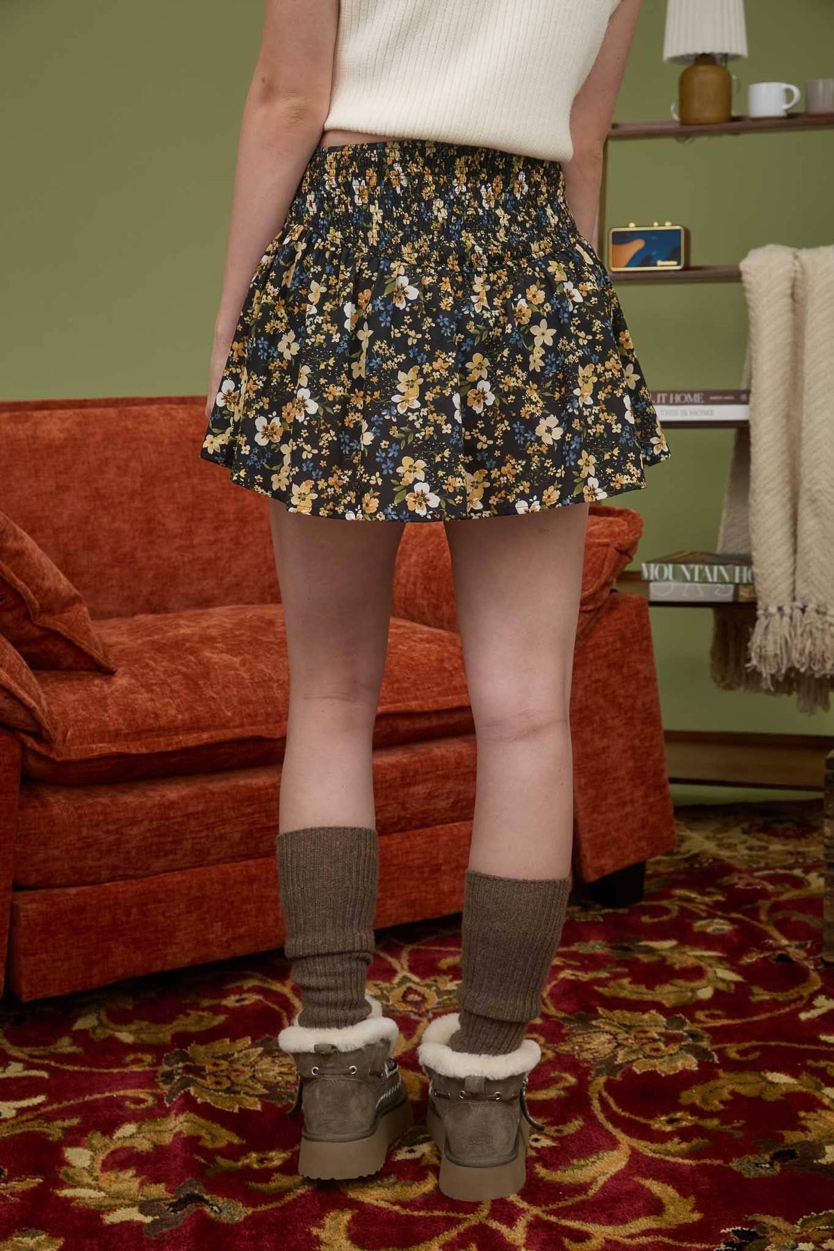 Women's Skirts - FLORAL SMOCKED LACE-UP DETAIL MINI SKIRT - BROWN MULTI - Cultured Cloths Apparel