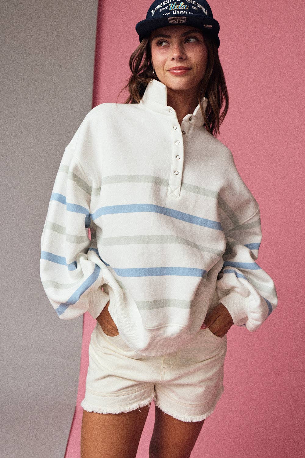 Striped Mock Neck Pullover Relaxed Fit Add a touch of effortless style to your everyday look with this cozy striped pullover. Designed with a soft relaxed silhouette it features a mock neckline and a snap front detail that brings a clean modern feel. The wide sleeves create an easy comfortable shape while the classic stripe pattern adds a fresh timeless touch perfect for layering through every season - Soft knit fabric with a smooth comfortable feel - Mock neckline with snap front detail - Relaxed drop shoulder for a laid back fit - Wide sleeves for an easy cozy silhouette - Classic stripe design for a clean polished look Perfect For Casual days coffee runs weekend errands or layering with denim and basics for a simple elevated outfit