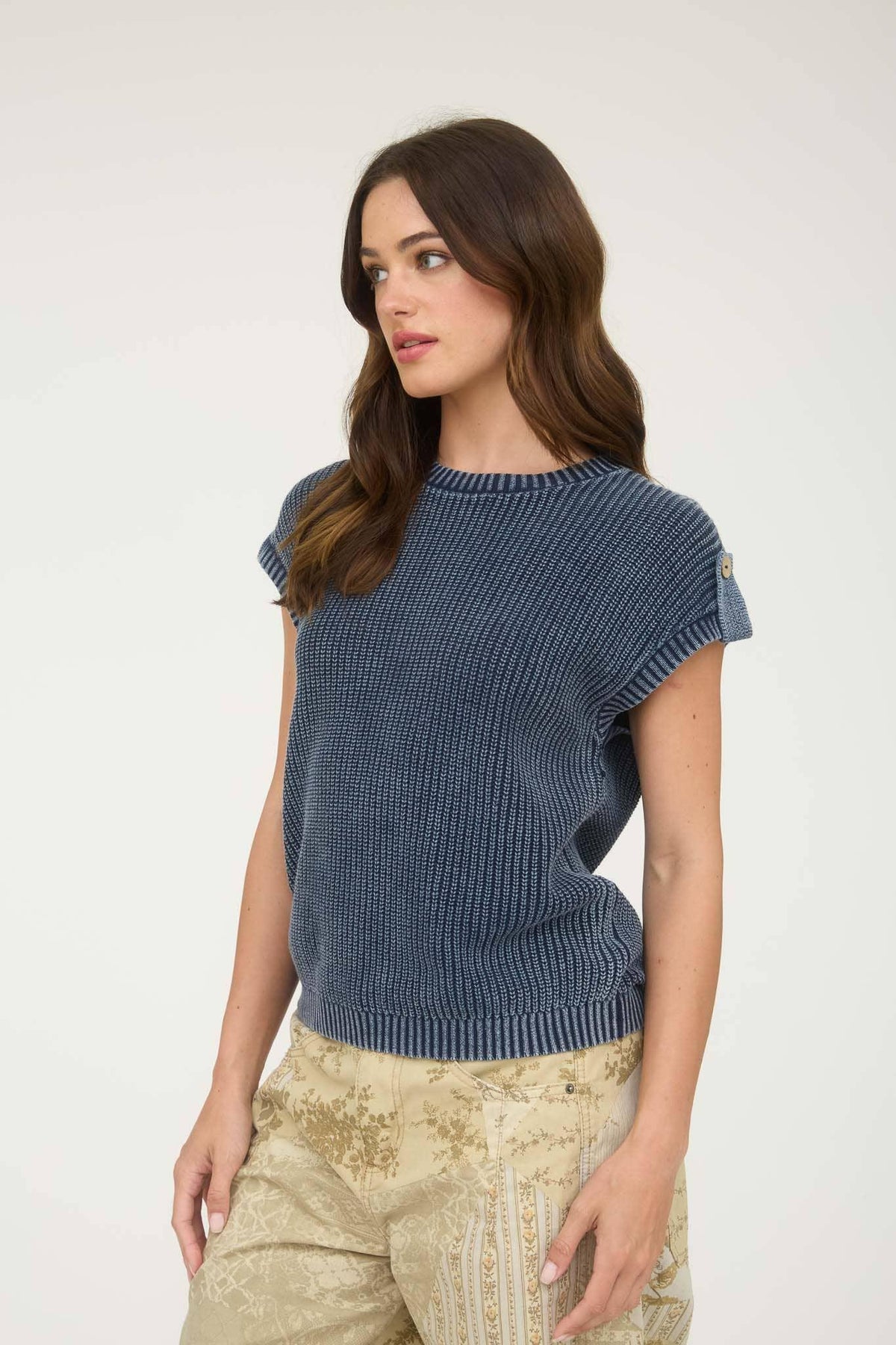 CREW NECKLINE SHORT SLEEVES TAB SLEEVE DETAIL RELAXED FIT RIBBED TRIM DETAIL WASHED KNIT PATTERN KNIT PULLOVER SWEATER TOP 100%COTTON