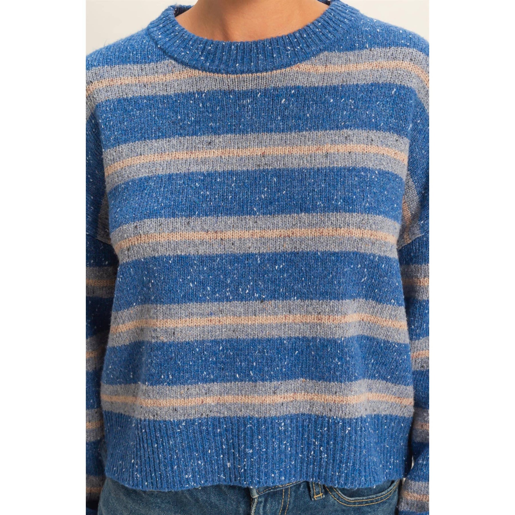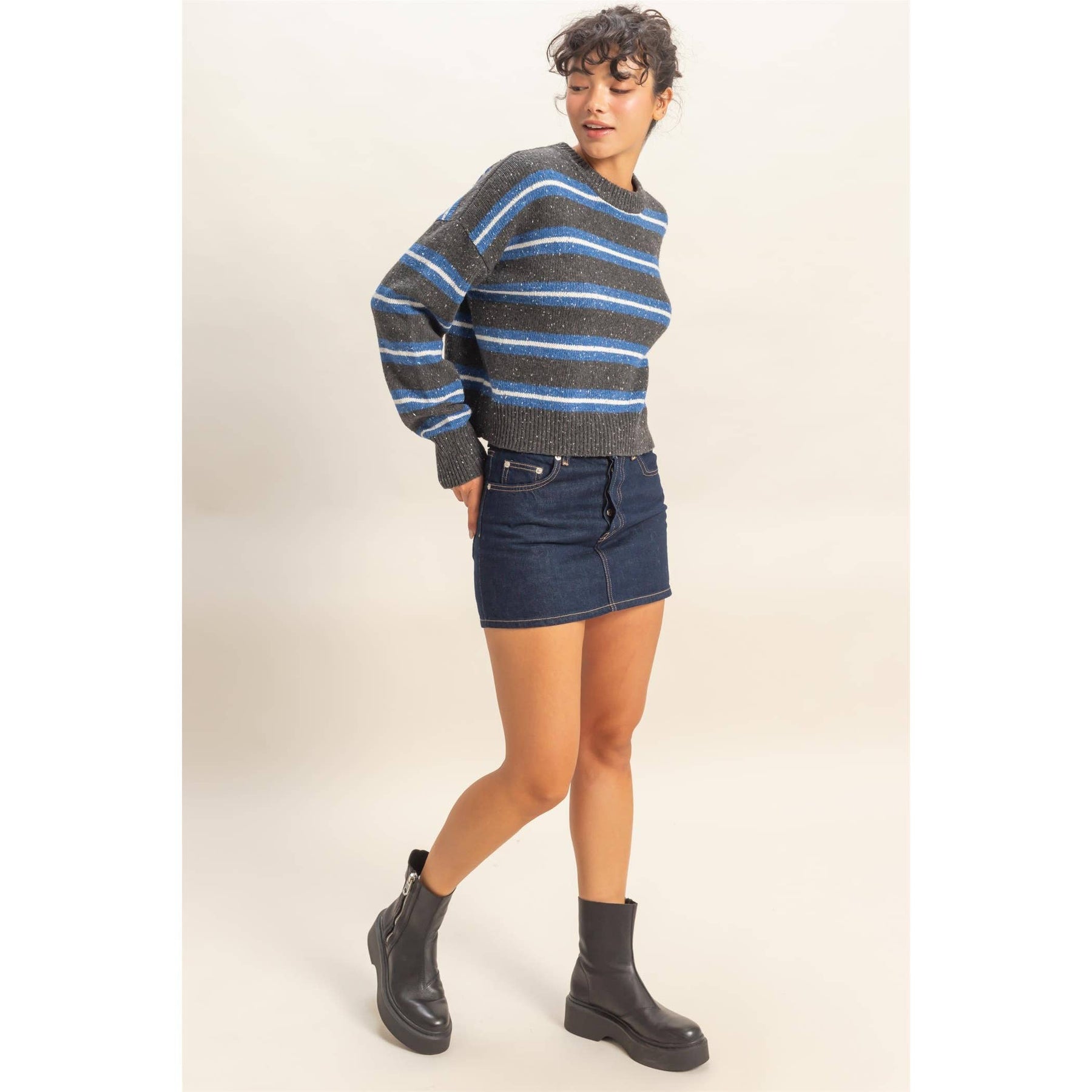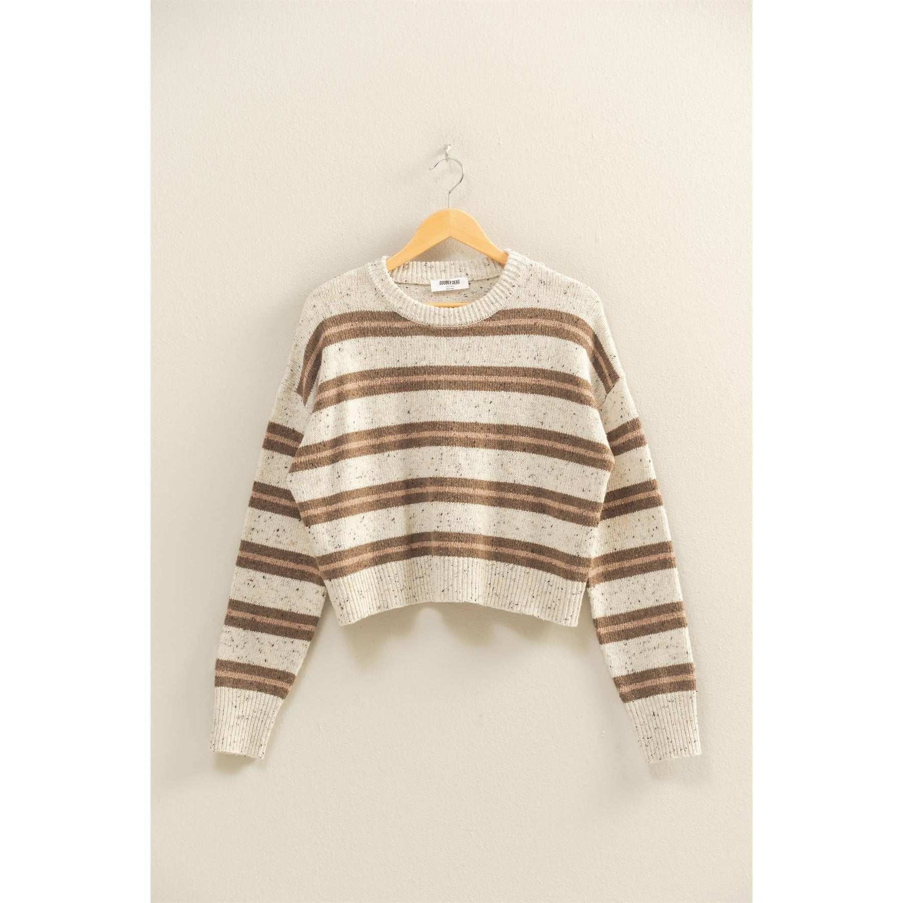 This sweater exudes a relaxed silhouette marked by horizontal stripe detailing, perfect for versatile styling. Its soft texture ensures comfort, making it ideal for layering during cooler months. Style with denim for a casual outing or pair with tailored trousers for a refined yet cozy ensemble. 50% acrylic 50% polyester Model Is 5' 7" Tall, 32" Chest, 25" Waist, 36" Hips And Wearing A Size Small Imported. Designed In The USA