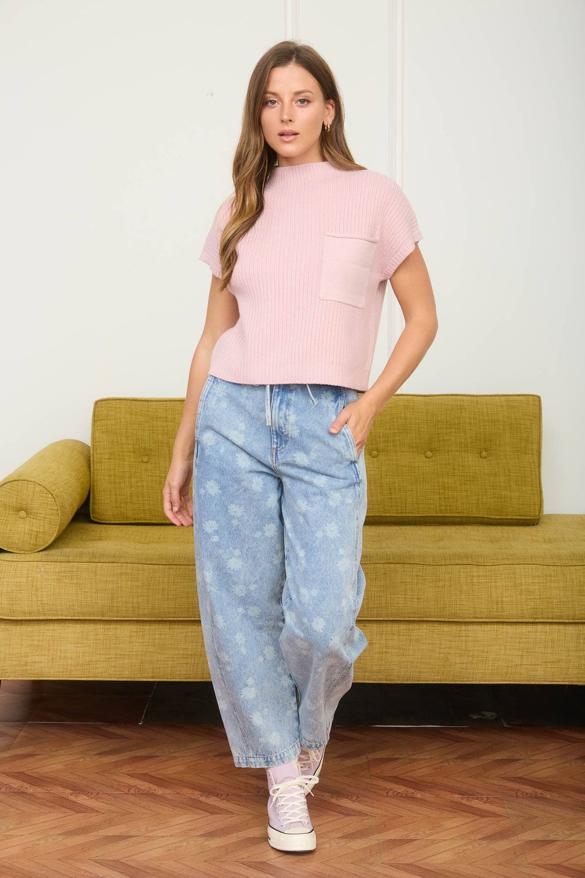 Women's Short Sleeve - MOCK NECK POCKET DETAIL SHORT SLEEVE KNIT SWEATER - PINK - Cultured Cloths Apparel