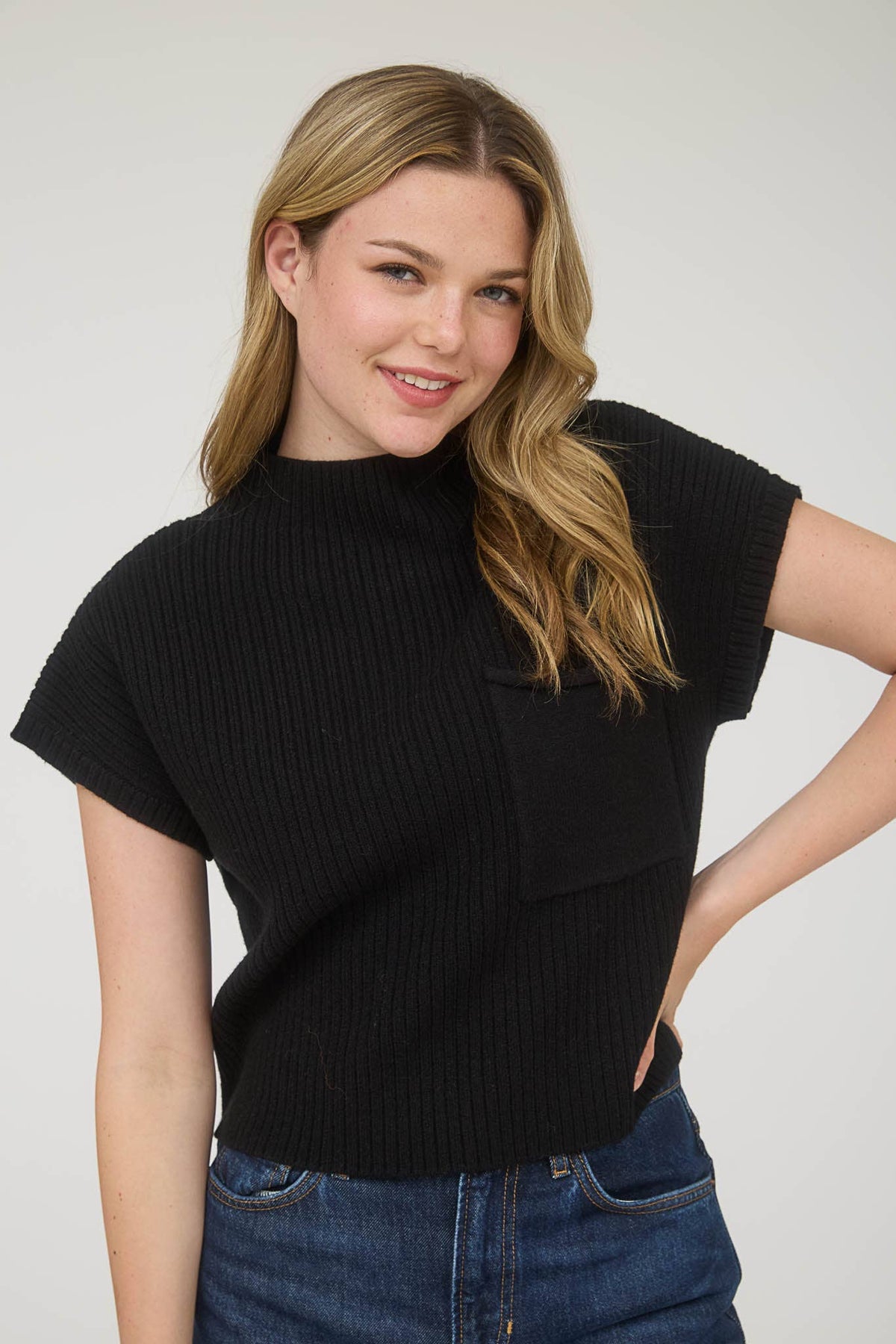 MOCK NECK POCKET DETAIL SHORT SLEEVE KNIT SWEATER