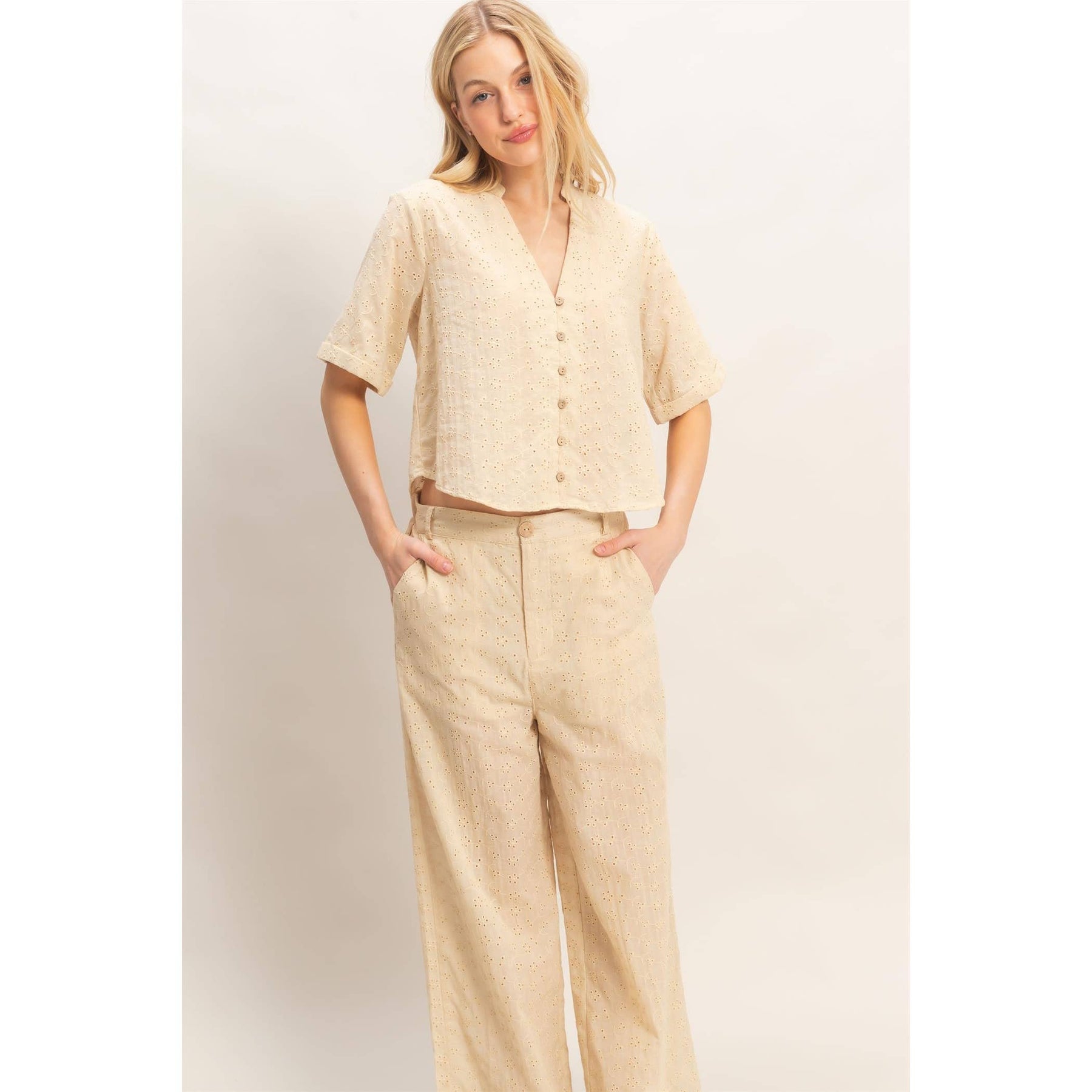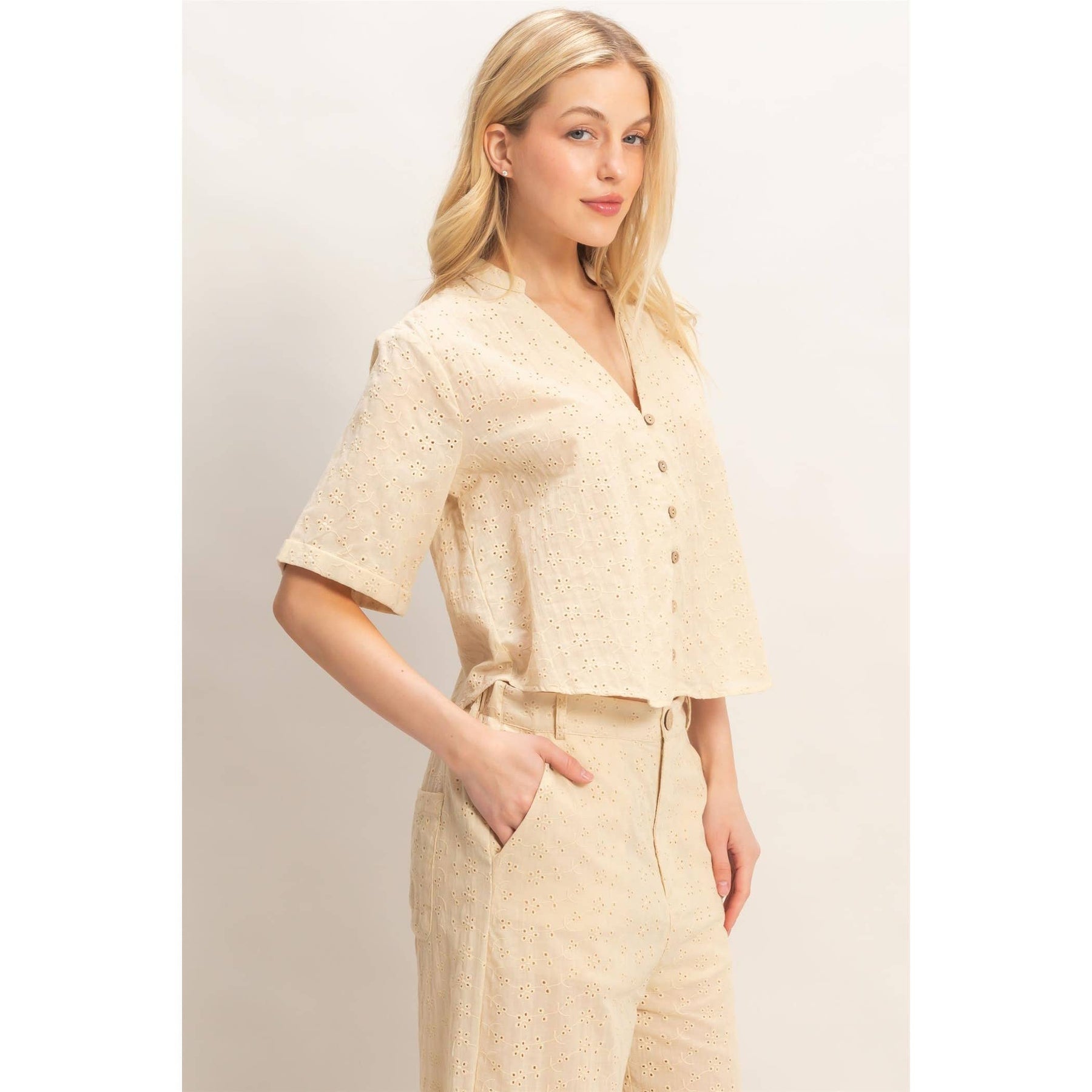 This floral eyelet top features a mandarin collar and half sleeves for a relaxed fit. The button-down front adds a classic touch while maintaining a casual vibe. Style it tucked into high-waisted denim shorts for an effortlessly put-together summer look. Fabricated with soft, breathable material. Model Is 5' 6" Tall, 32" Chest, 24" Waist, 32" Hips And Wearing A Size Small Imported. Designed In The USA