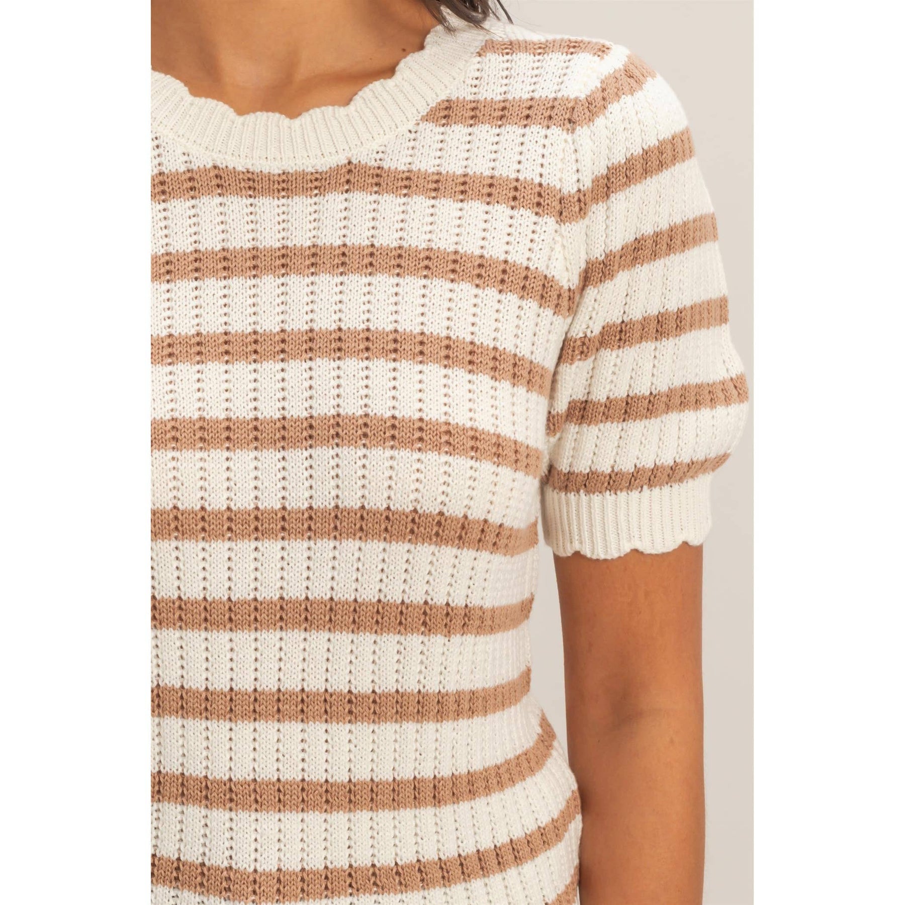 This top is crafted from a soft cotton-acrylic blend, featuring a ribbed eyelet knit and horizontal stripes. It has a scalloped crew neckline and short puff sleeves finished with scalloped edge. Cut in a fitted silhouette, it provides a polished look. Style this piece with a distressed denim skirt and sandals for a chic effortless look. 55% Cotton 45% Acrylic Model Is 5' 7" Tall, 32" Chest, 23" Waist, 34" Hips And Wearing A Size Small Imported. Designed In The USA