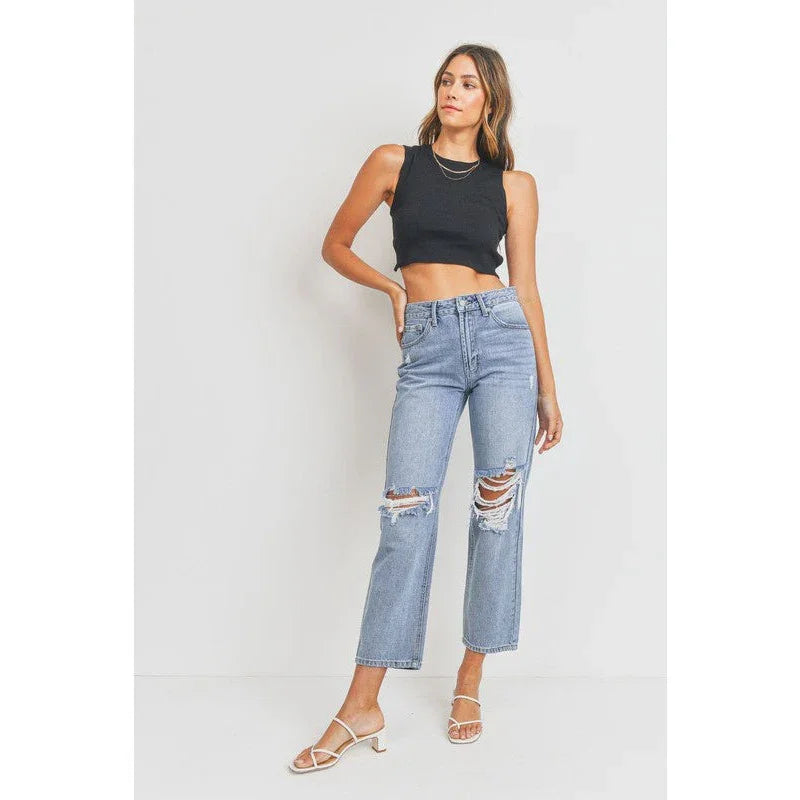 KNEE DISTRESSED CROPPED STRAIGHT LEG JEANS WITH REGULAR HEM IN LIGHT WASH DENIM 10.5" RISE, 28" INSEAM, 8" OPENING NON STRECH
