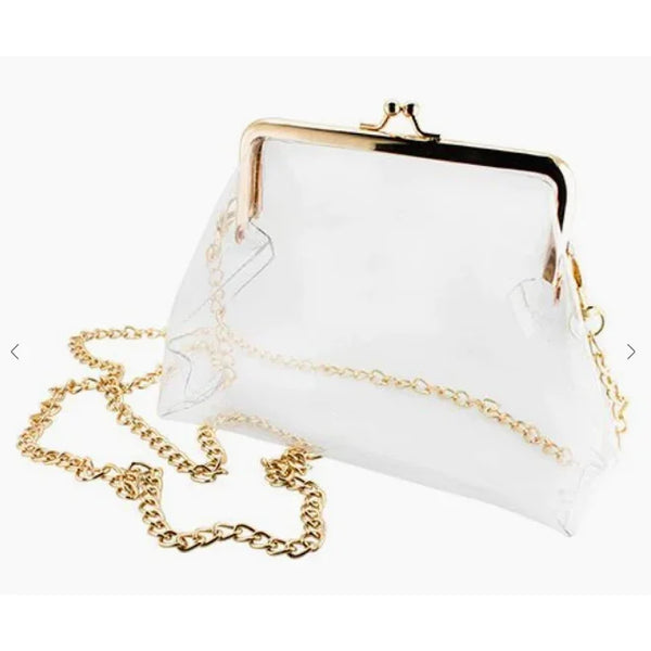 Looking for a stadium approved crossbody bag that is both stylish and functional? Look no further than our Kiss Lock Crossbody Stadium Bag! This clear PVC bag features gold hardware accents and a timeless gold chain, making it the perfect accessory for any outfit. The main compartment features a classic kiss lock closure to keep your belongings safe and secure. Plus, the bag comes with an adjustable strap so you can wear it over your shoulder or across your body. Whether you're headed to the game or out on the town, this crossbody bag is a must-have!