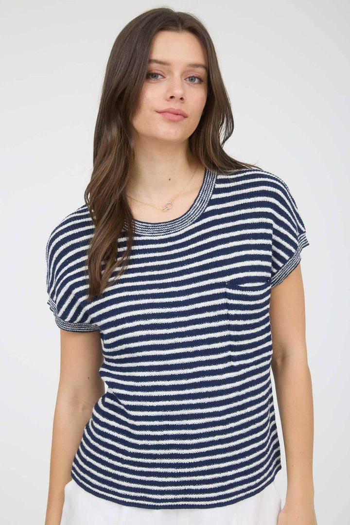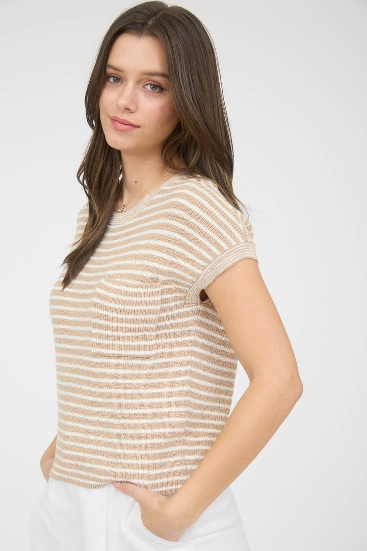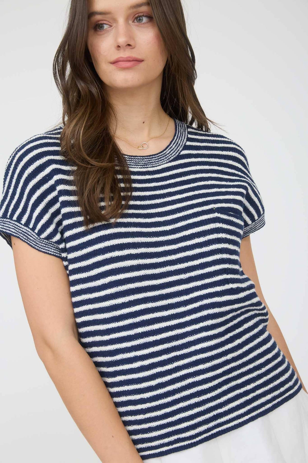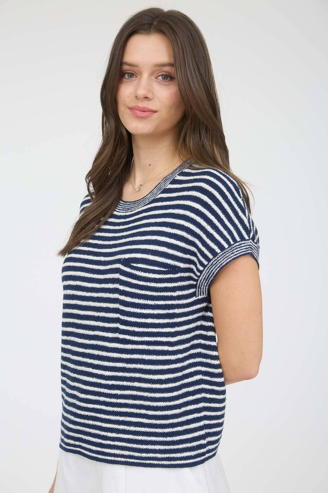ROUND NECKLINE SHORT SLEEVES POCKET DETAIL RELAXED FIT STRIPE PATTERN SWEATER KNIT PULLOVER TOP 74% COTTON, 26% NYLON