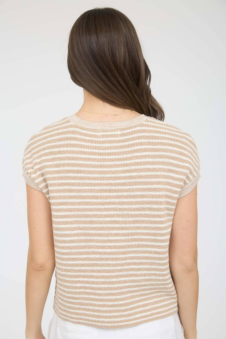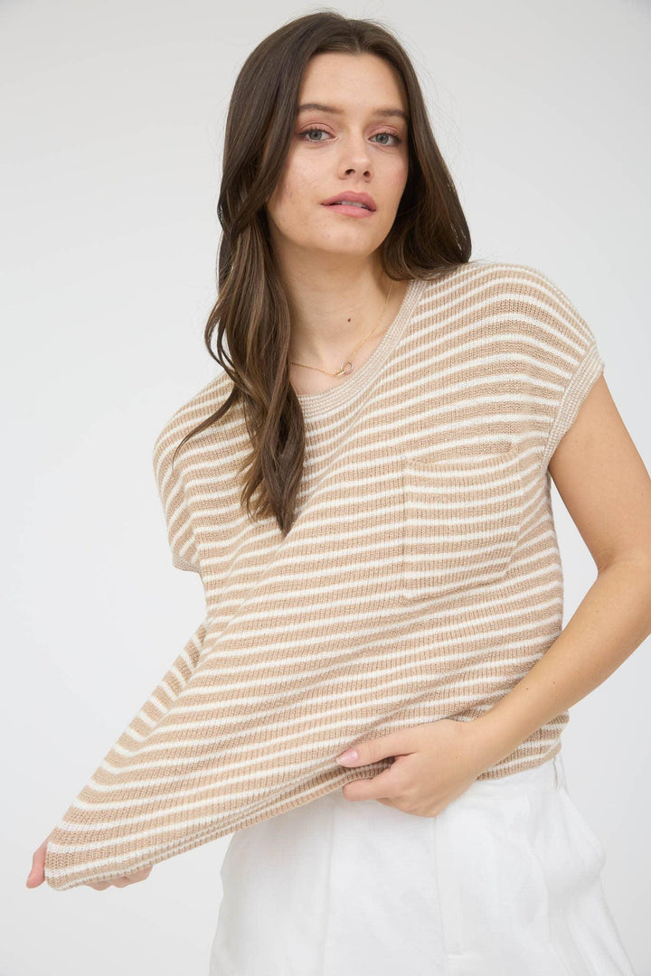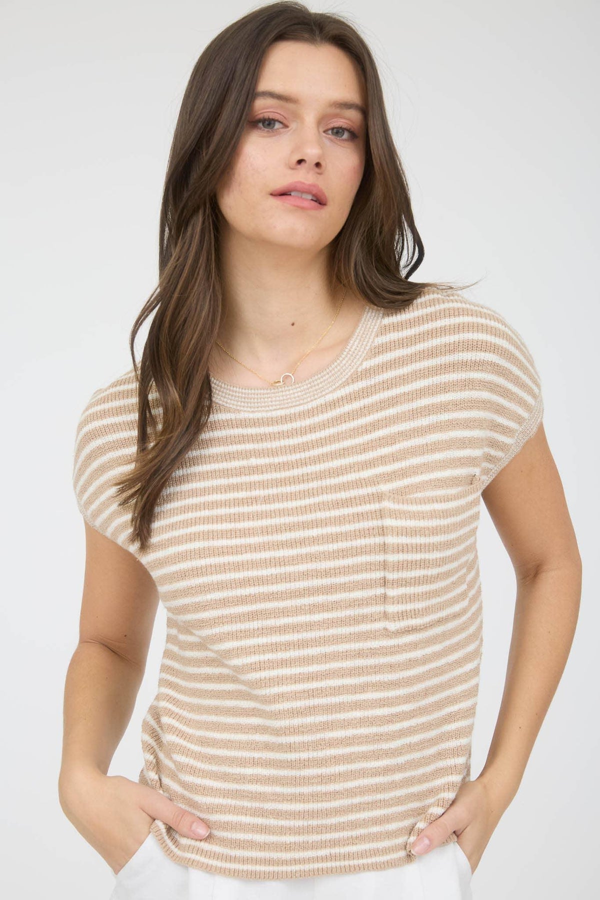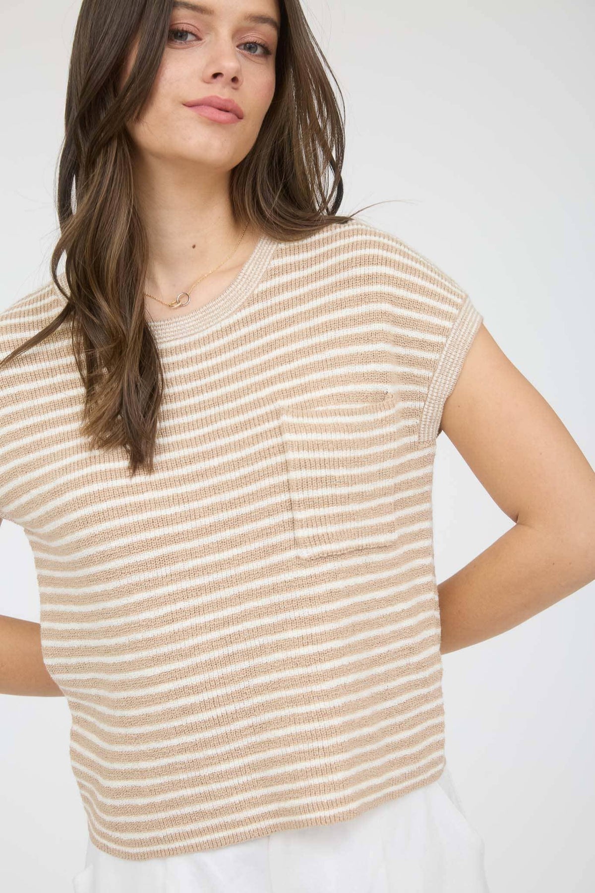 ROUND NECKLINE SHORT SLEEVES POCKET DETAIL RELAXED FIT STRIPE PATTERN SWEATER KNIT PULLOVER TOP 74% COTTON, 26% NYLON