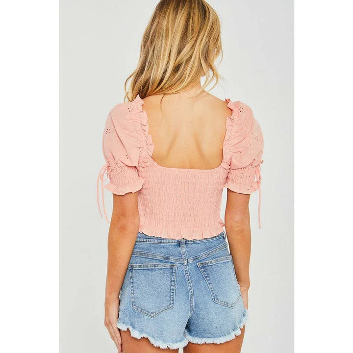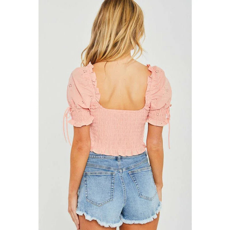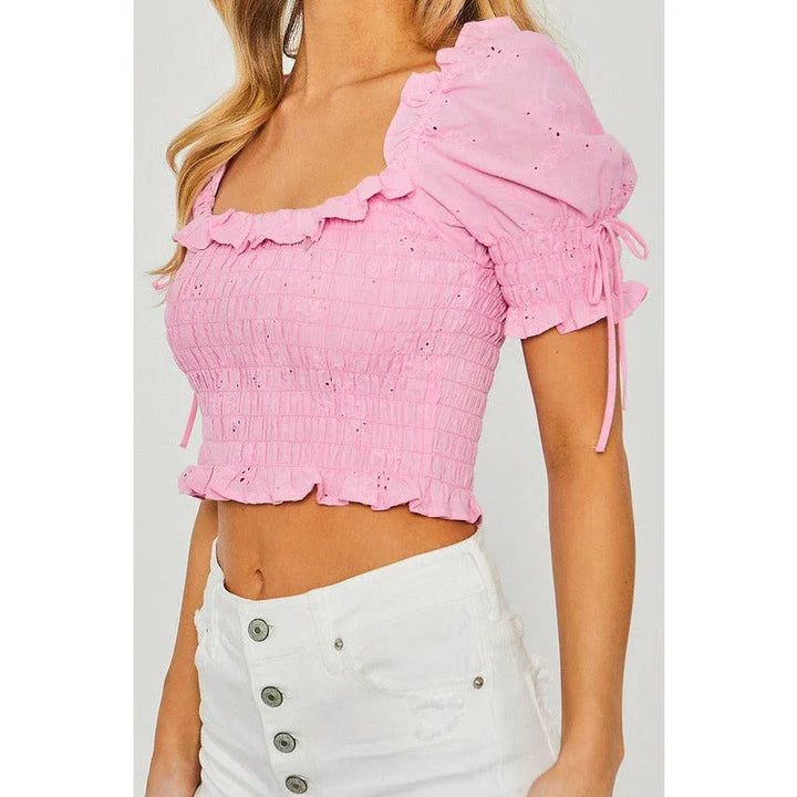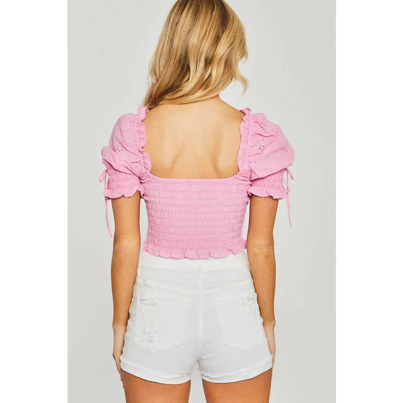 Women's Short Sleeve - Woven Solid Smocked Puff Sleeve Crop Top - Pink - Cultured Cloths Apparel